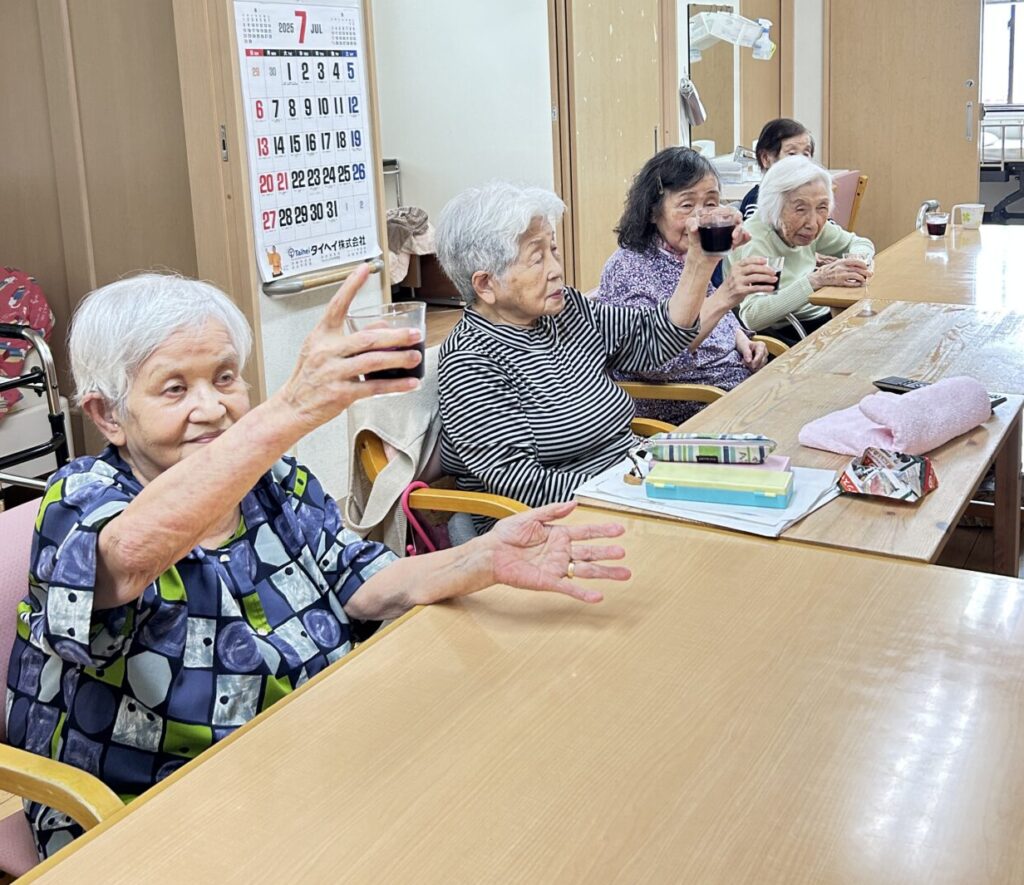 ご利用者様に葉っぱを取っていただき、紫蘇ジュースが出来上がりました