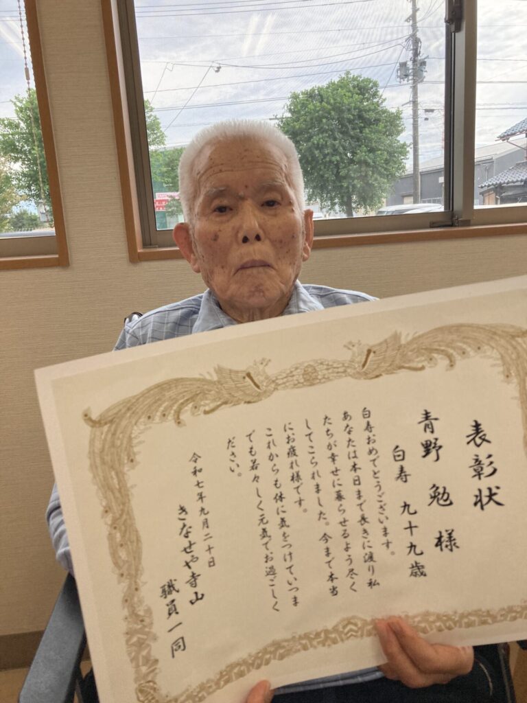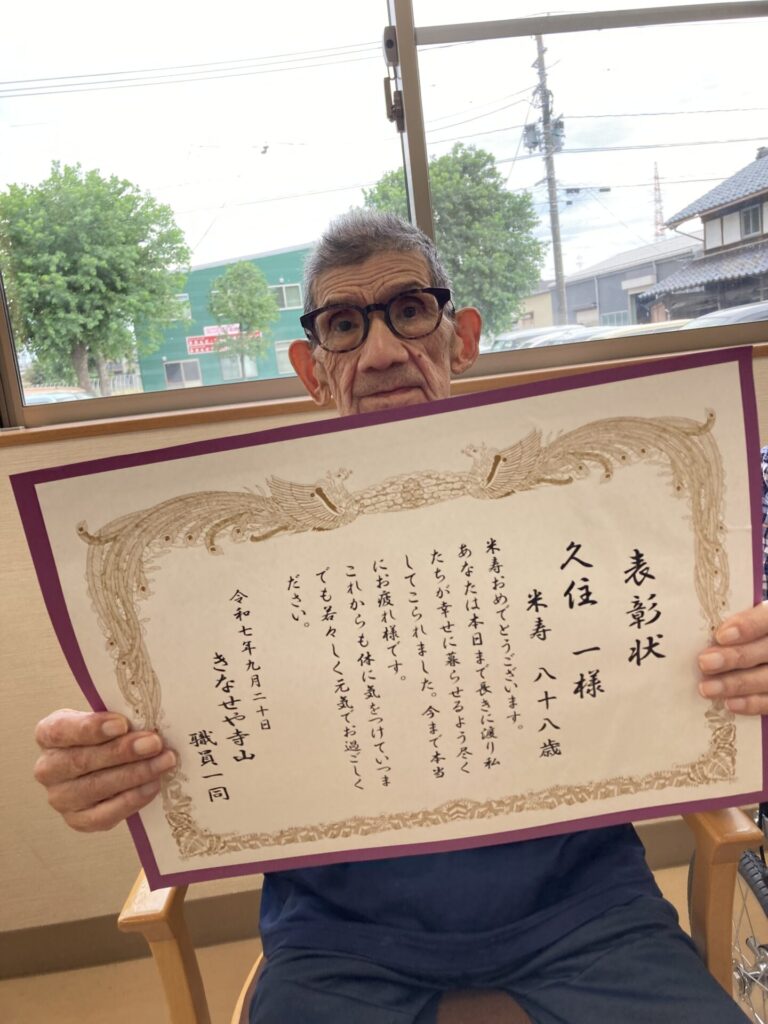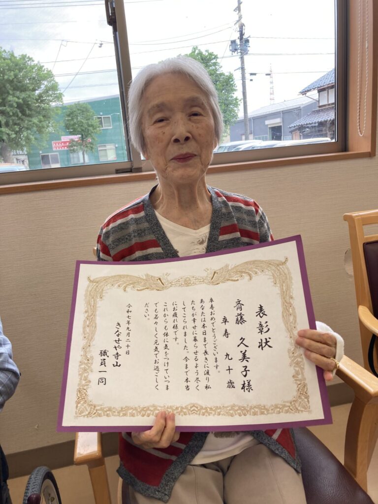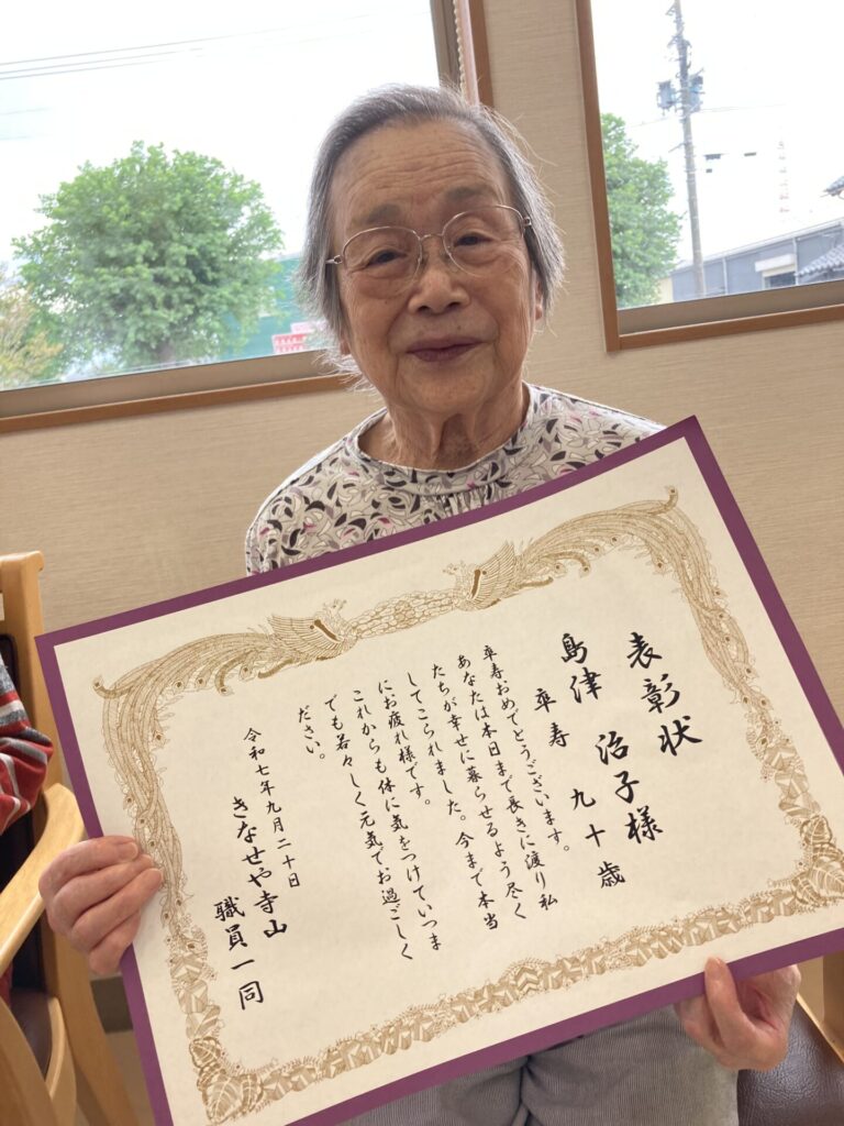 お知らせ なじみの家 きなせや寺山 敬老会② 2025年09月22日 祝い年の方に表彰状をお渡しし、9月の誕生日の方にはプレゼントとバースデーソングをみんなで歌いお祝いしました☺ 寺山の最高齢は100歳です✨なんとこの日が100歳のお誕生日でした🎉🎉 いいね (8) きなせや内野の日常とBCPの取り組み😊😊😊 敬老会③