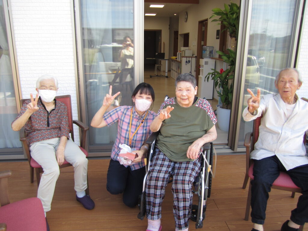 お知らせ なじみの家 きなせや姥ケ山 ひなたぼっこ🌞 2025年09月23日 日中はポカポカ暖かかったのでテラスに出て ひなたぼっこを楽しみました🥰 おやつはアイスクリームでした😋🍧 いいね (36) お買い物🧑🍳🍡 求人説明会&見学会を開催いたします💜