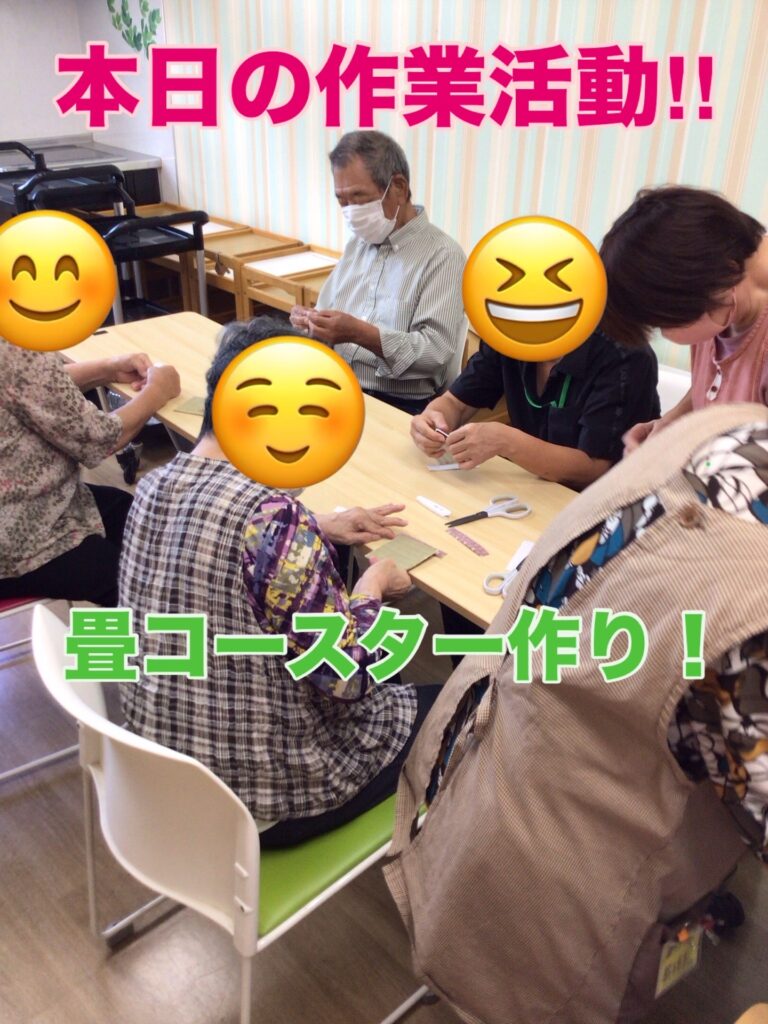 お知らせ 通所リハビリテーション 江風苑リハビリセンター100 ♡作業活動♡ 2025年09月30日 本日の作業活動は 畳コースター作りです♪ 皆さま細かいところまで、器用に丁寧に作業されていました♪ 素敵なコースターが完成しました!!! いいね (4) 江風苑感謝祭 inリハビリセンター100ッ! 書道レク