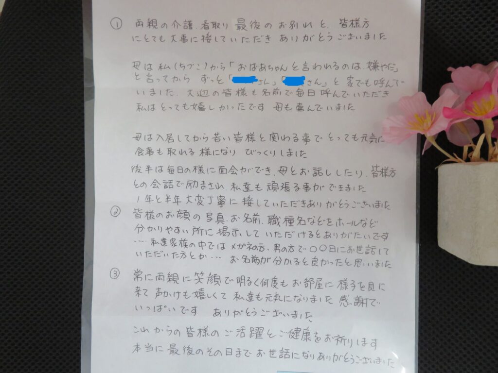 そのような中、ご家族様から心温まるお言葉をいただき、感謝の気持ちでいっぱいです。