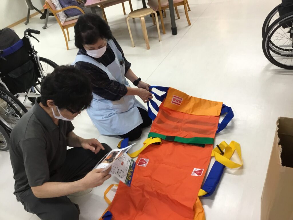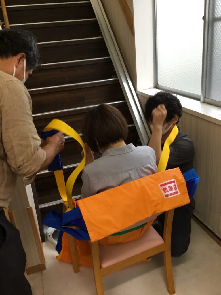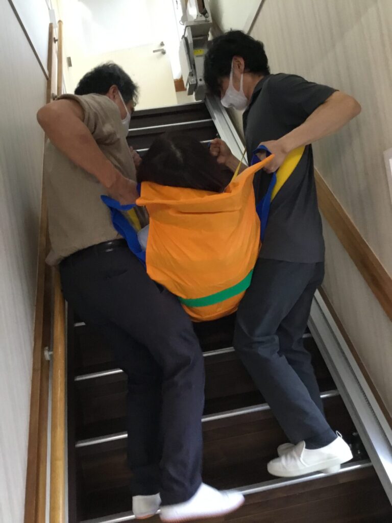 先日ベルト式タンカを使って、2階へ避難する訓練をしました。