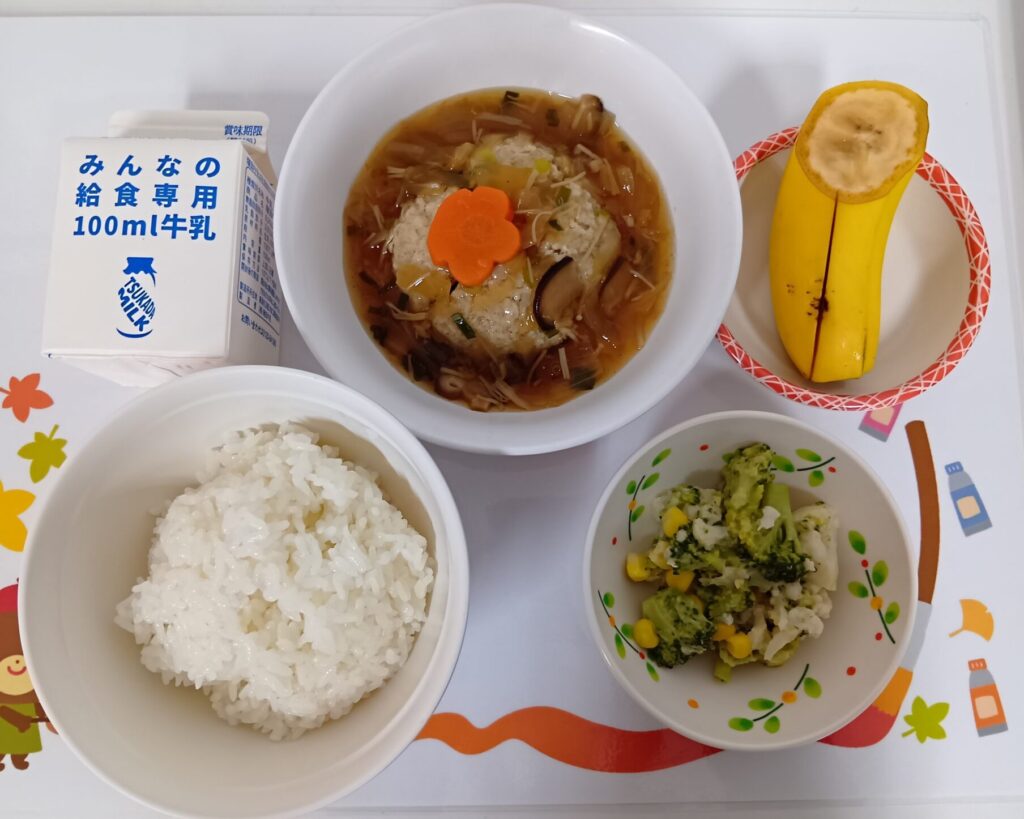 ●ご飯 ●きのこハンバーグ ●花野菜サラダ ●バナナ ●牛乳