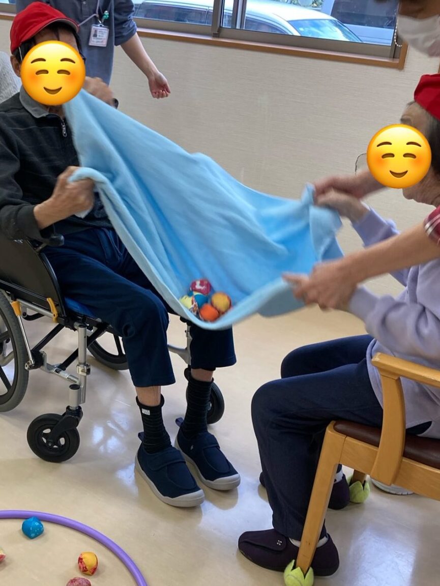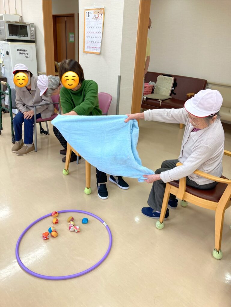 バスタオルにお手玉を10個乗せフラフープの中めがけてせーので!!ポーイ!!!