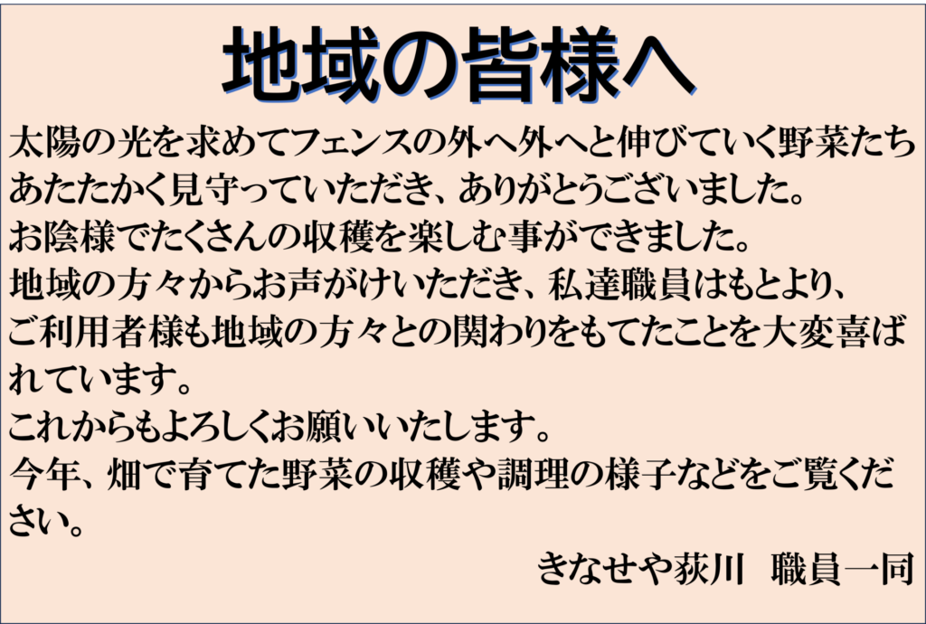 畑の様子や、ご利用者様との様子を地域向けに掲示させていただきました。