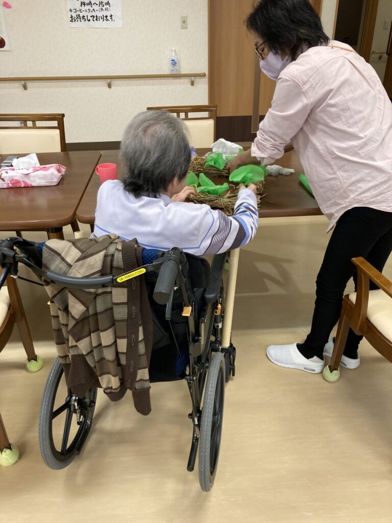 朝顔のつるを乾燥させて作ったリースにお花紙をつけていきます…