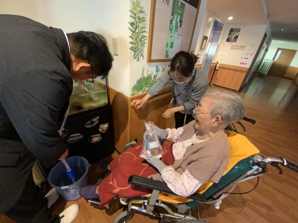 お知らせ せきやの里 せきやの里水槽🐟 2025年11月26日 デメキンが入り水槽が一気に華やかになりました✨ ご利用者様が見守る中、水替えも行いました! 届いたばかりのデメキンにきれいな色だね~とおっしゃっていました😊 いいね (9) サンパレス輝 体操タイム♪ 玄関口 (微?)美リニューアル♪