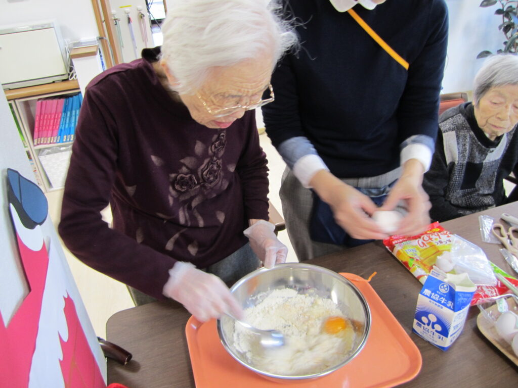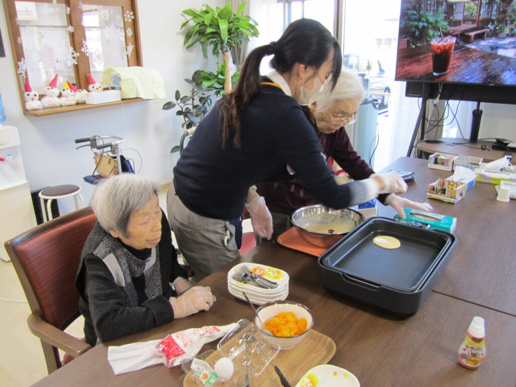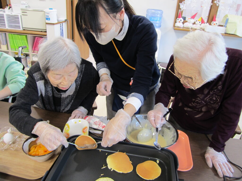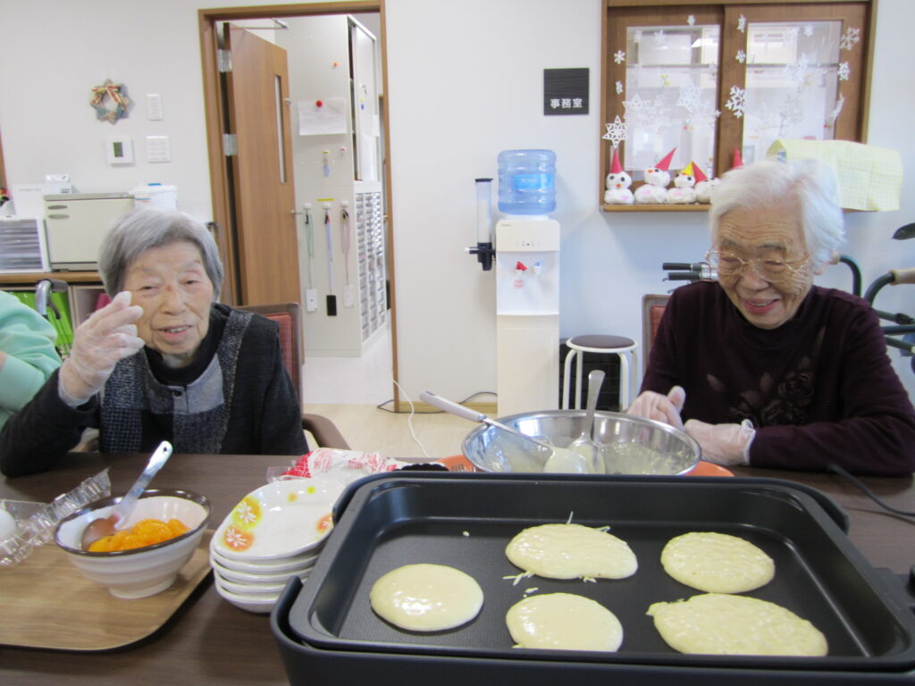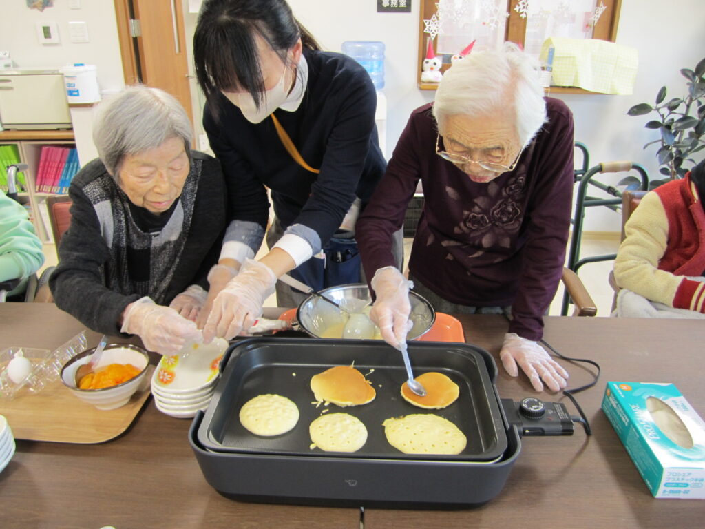 お知らせ なじみの家 きなせや姥ケ山 調理レクレーション🥞 2025年12月07日 ホットプレートでホットケーキを作りました🤗 卵を割って、粉入れて、牛乳入れて、混ぜます😊 焼いて、ひっくり返して🍳 上手に出来上がりました👏🏻 みんなで美味しくいただきました🥞😋 いいね (13) カレーの日🍛 🍎⭐🎄クリスマスフォト№2🎄⭐🍎