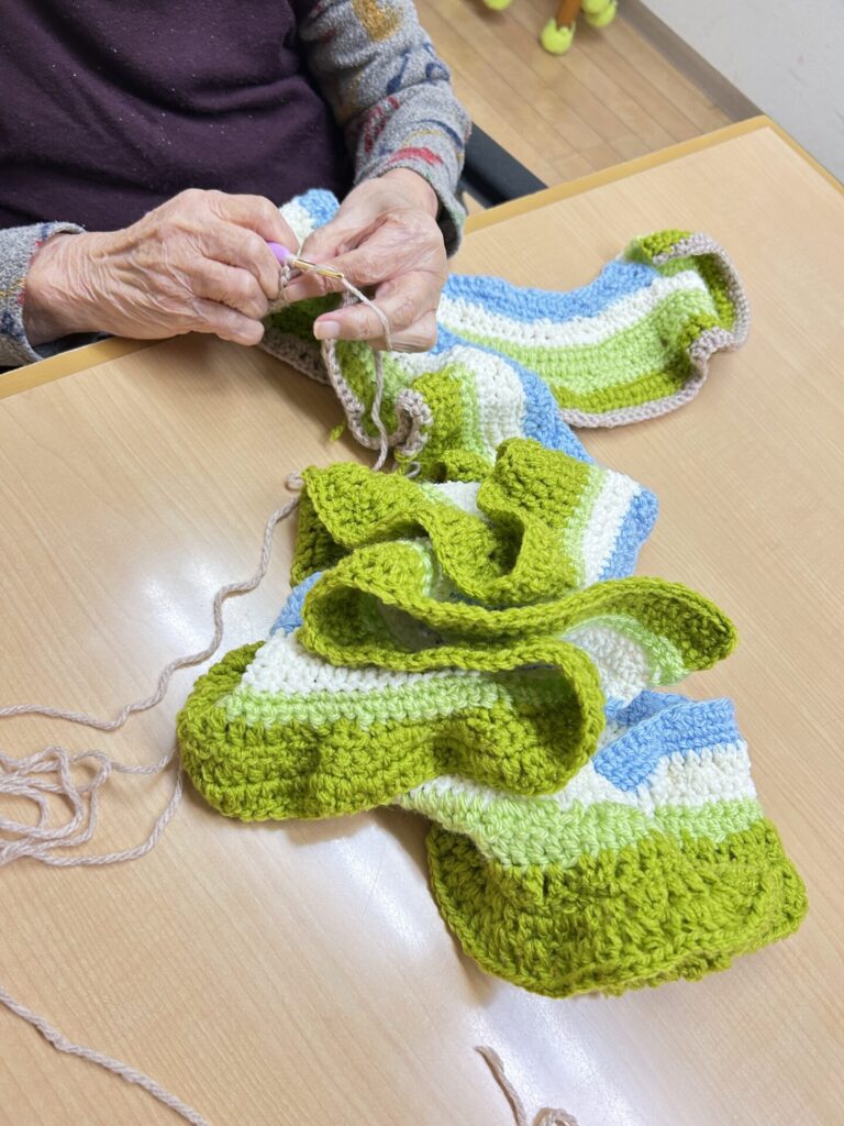 今日紹介する飾りは、ご利用者様が毛糸で編んでくださった物を