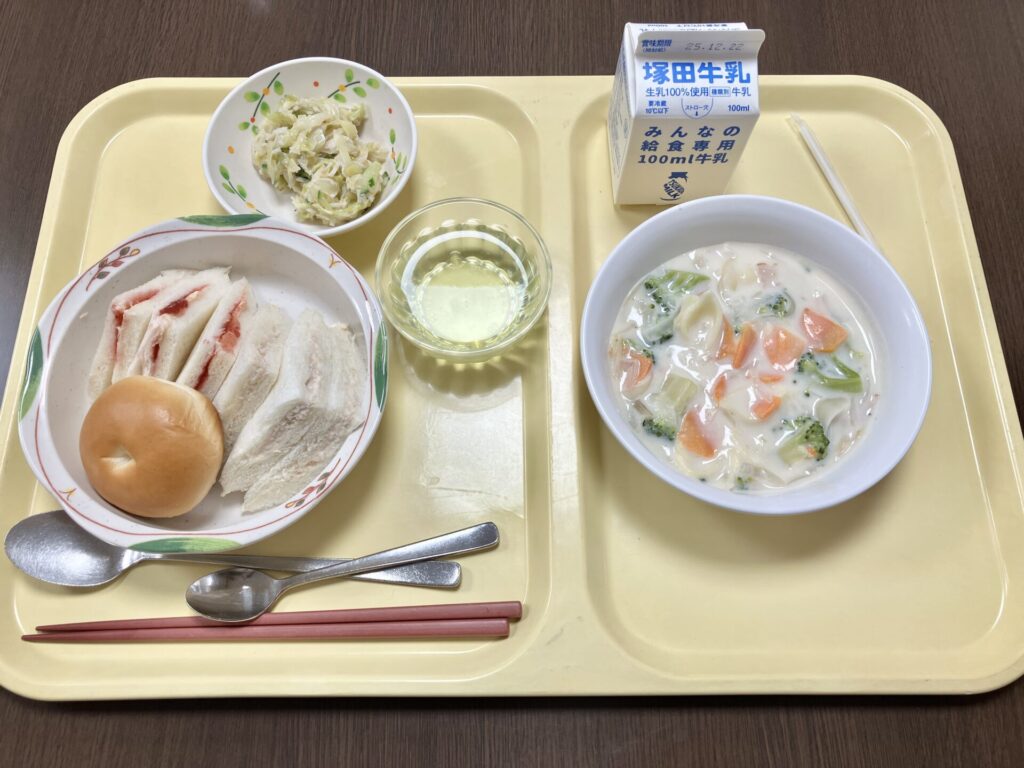 ★施設内を見学後、給食を試食し評価を行ないました。献立はサンドイッチ、チャウダー、キャベツのサラダ、青リンゴゼリー、牛乳でした。