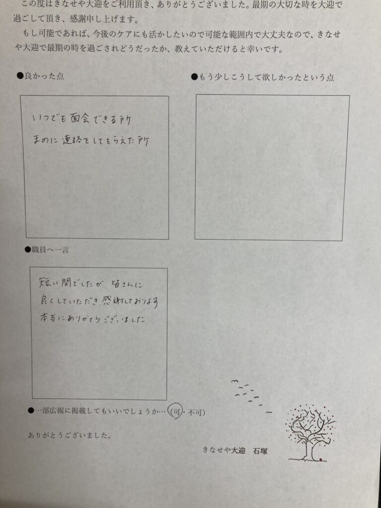 そのため当施設にて、ご家族様にお越しいただき、大切な方々に見守られながら、穏やかな時間の中で最期を迎えられました。
