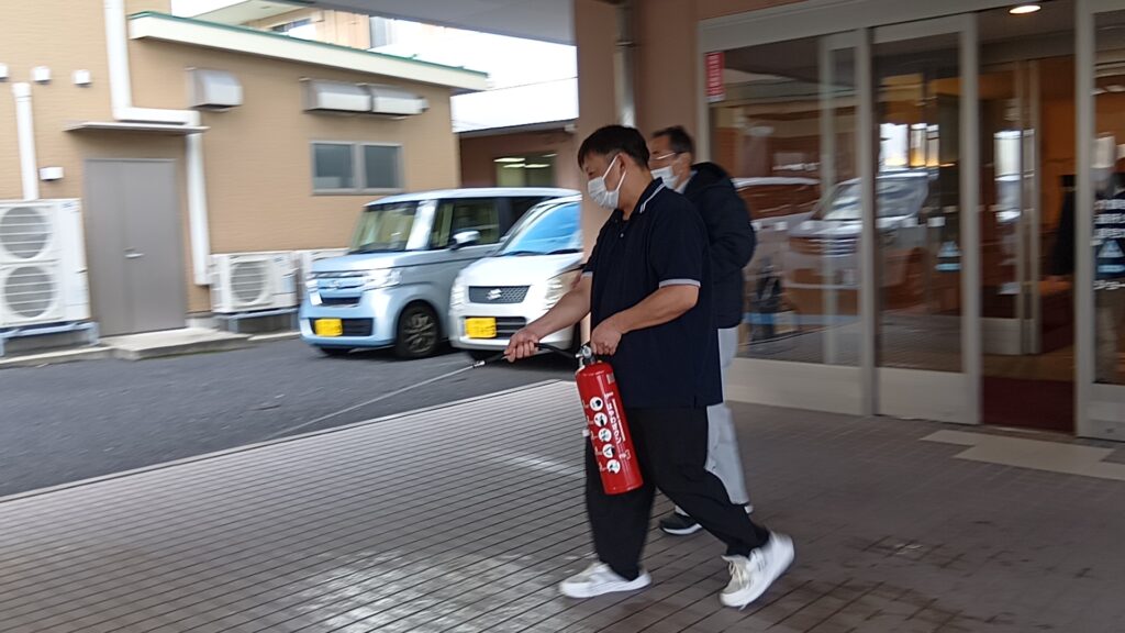 初期消火ができそうな場合の消火器🧯、消火用散水栓の使い方を確認しました。消火器🧯は15秒ほどしか消火剤がでないので、火が消えなければすぐに避難することが大切。また散水栓は、水の勢いがとても強いので両手でしっかり持ち、飛ばされないように構えてから放水しないと危険。建物の地下にあるタンクの水を使うのでカラになると止まる。