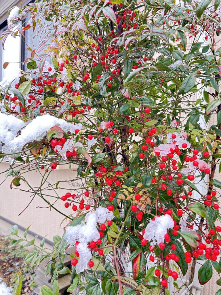 南天の木にも雪が積もり、赤と白のコントラストがとても綺麗です