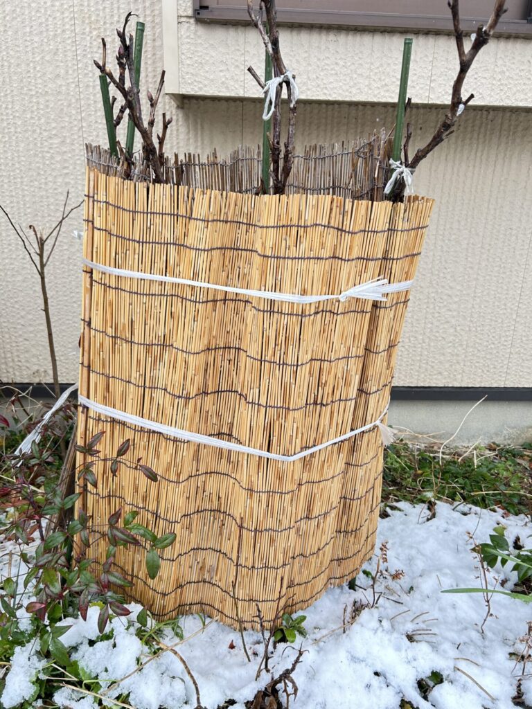 春にきれいに咲いていただくために、たいせつに雪囲いをつけました