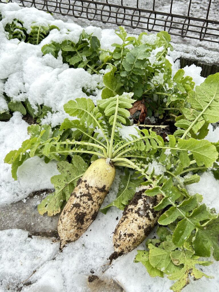 雪を被った畑に行き大根を収穫してきました