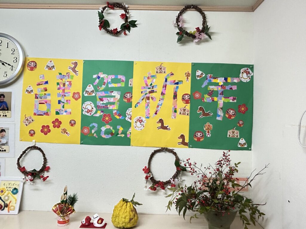 ご利用者様がちぎり・貼り絵をしてくださった謹賀新年の文字と、隠れてしまっていますが2026年