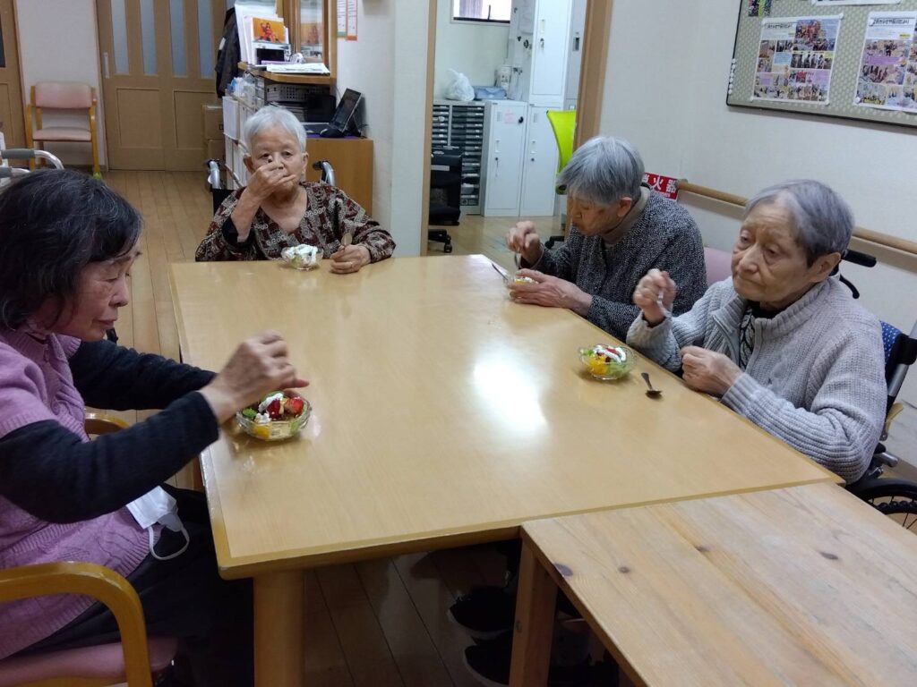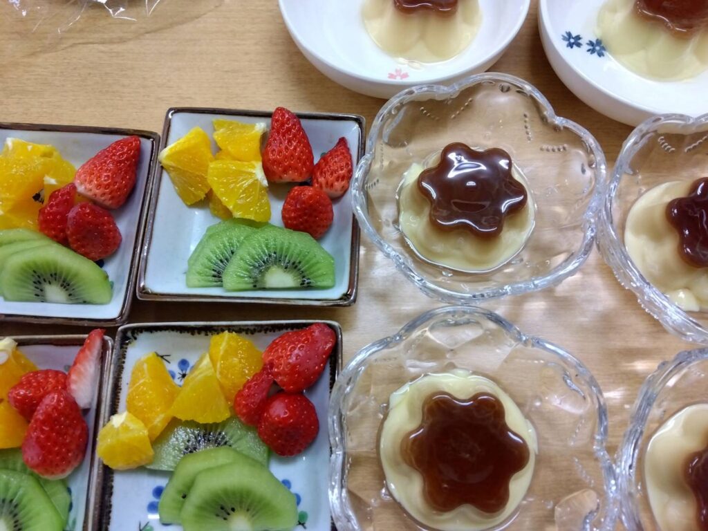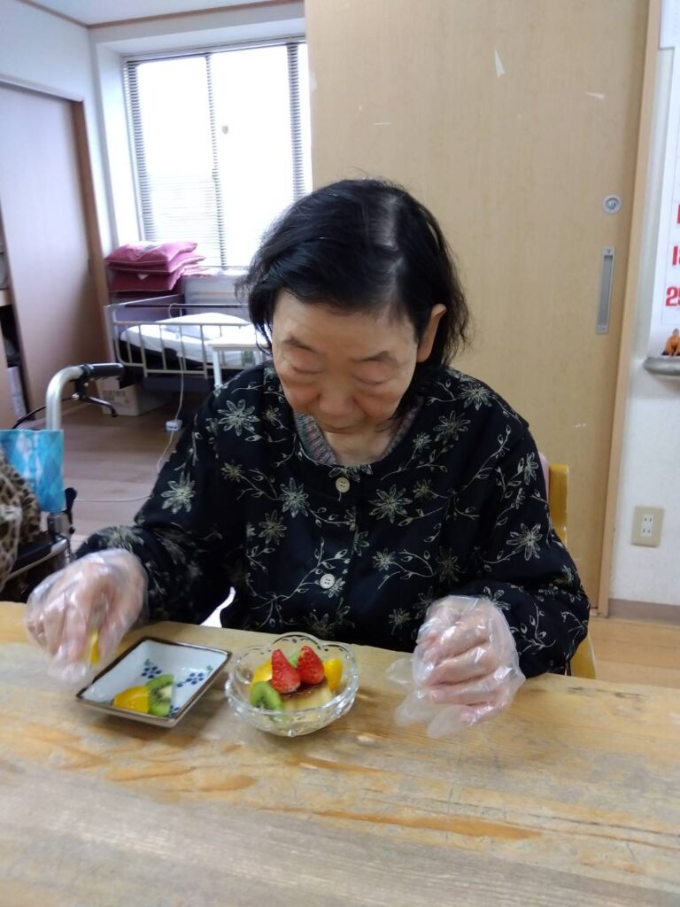 「おいしいね~」と、ごじぶんで飾られたプリンアラモードを美味しそうに召し上がられていました