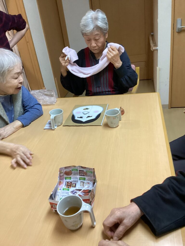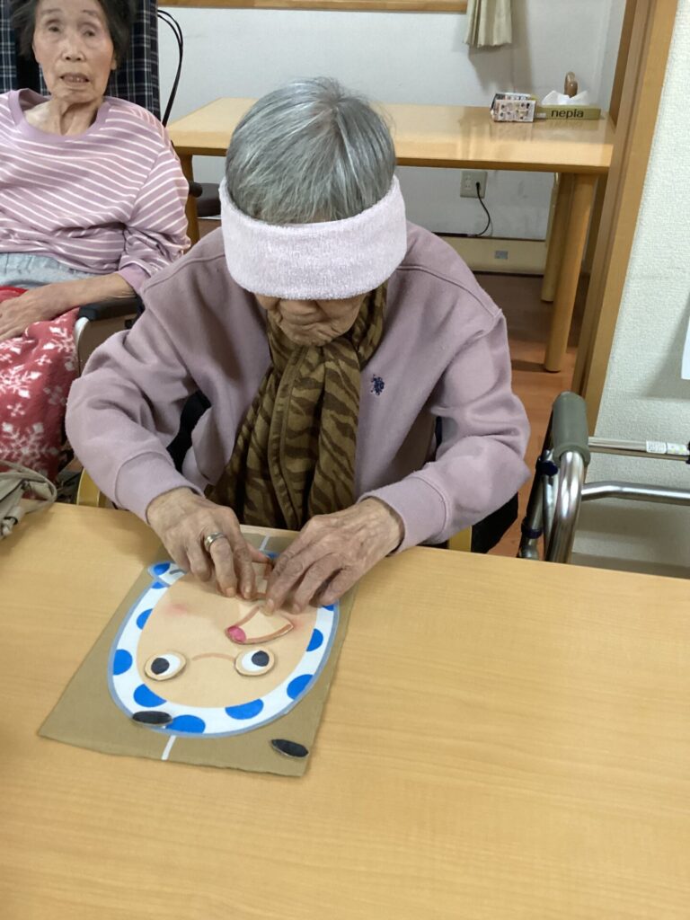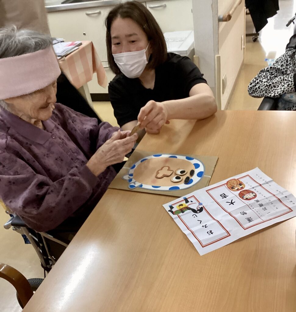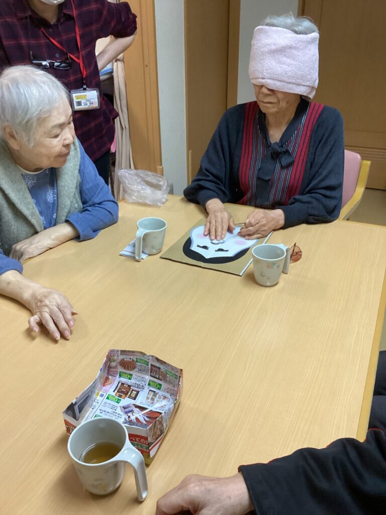 職員手作りの「ひょっとこ」と「おかめ」のお顔に挑戦していただきました。