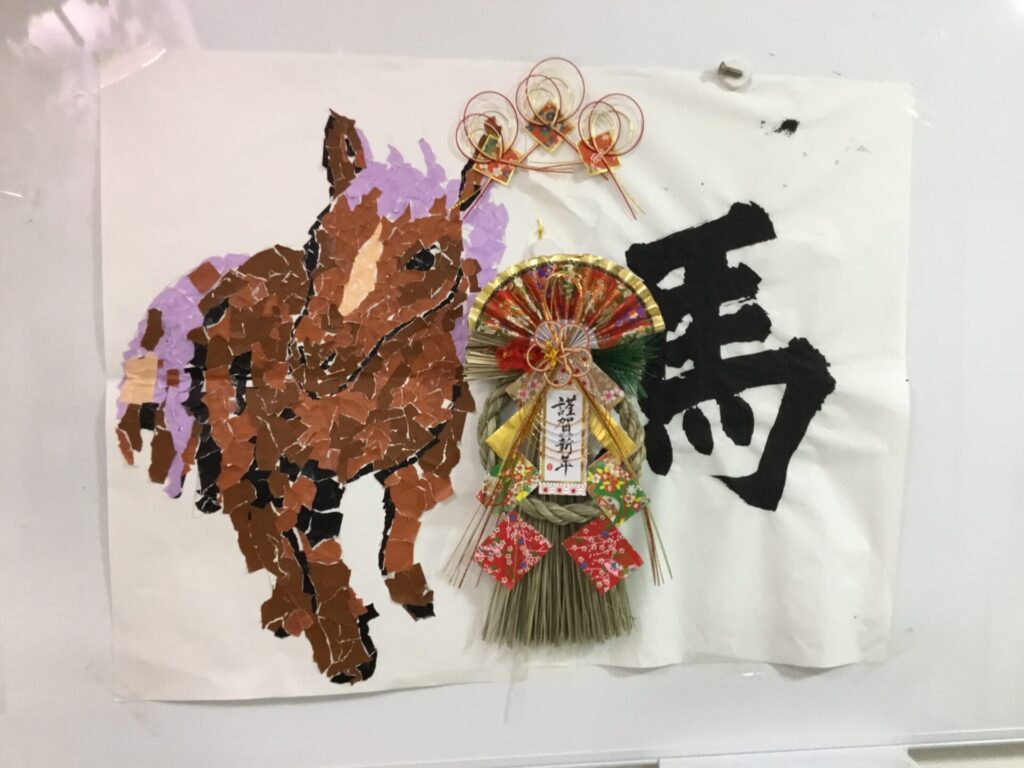 利用者様合作!今年の干支の午の貼り絵と書初めです♬