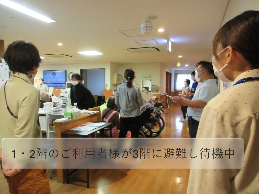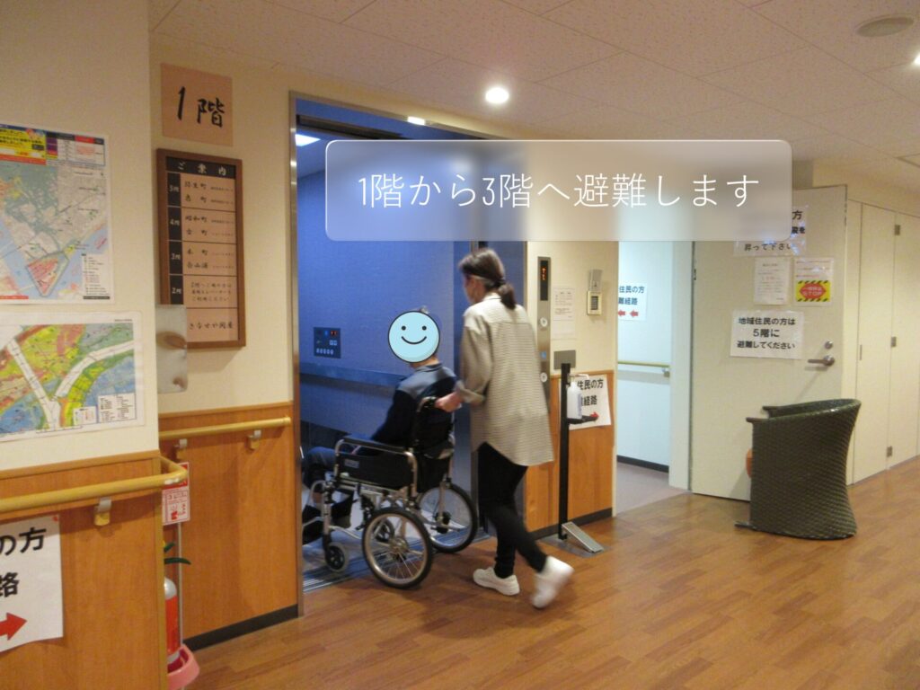 今回は水害を想定し、1・2階のご利用者様が3階へ避難します。