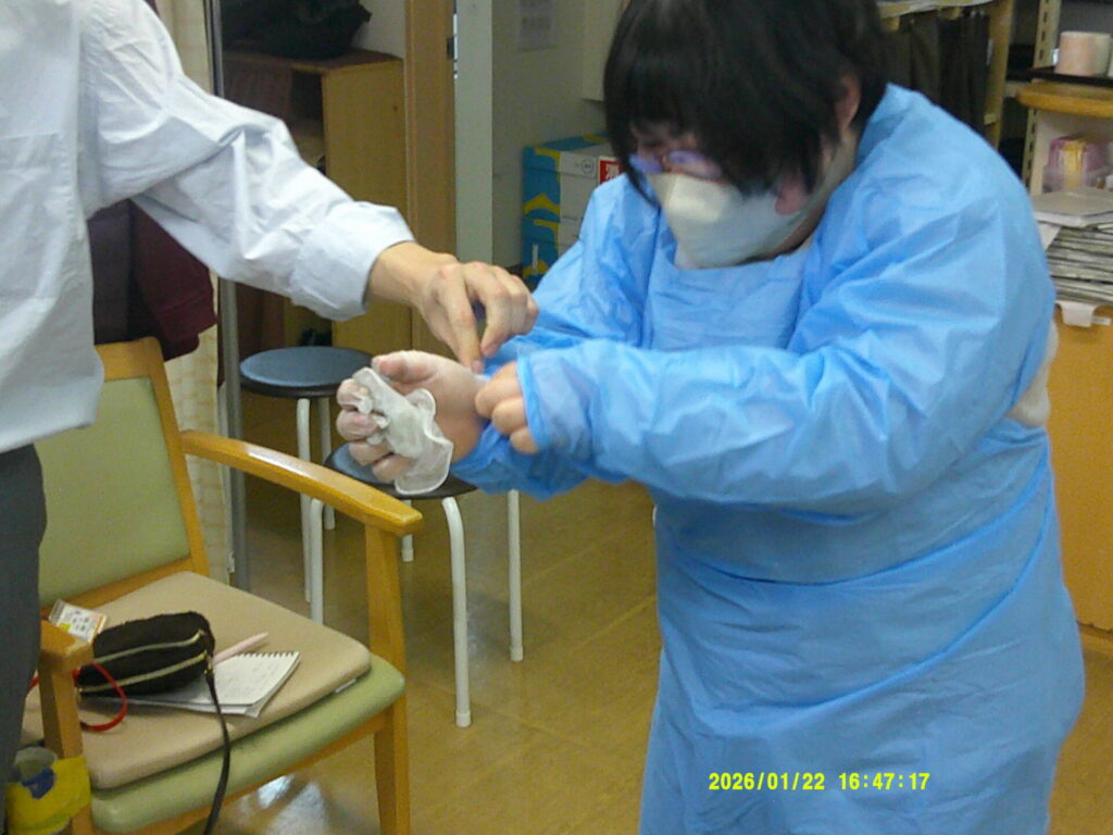 感染症が流行の時期で実際現場で処理に携わる機会が多くなると予想されるので、手順等の再確認の為に開催されました。