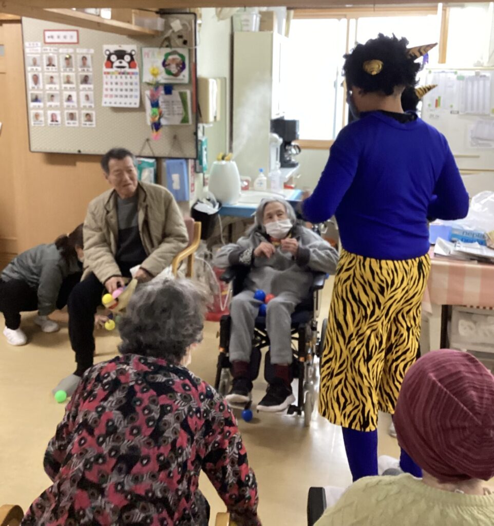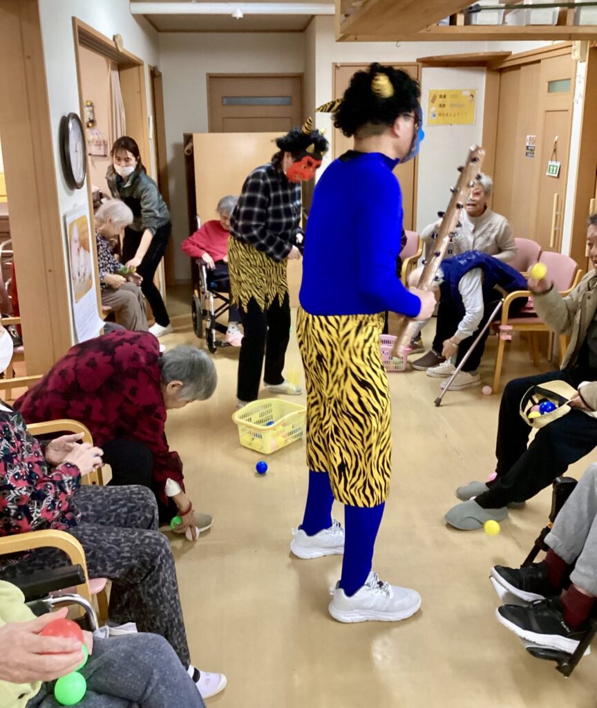 利用者の皆さまには、鬼を囲んでボールを投げて鬼退治に参加していただき、