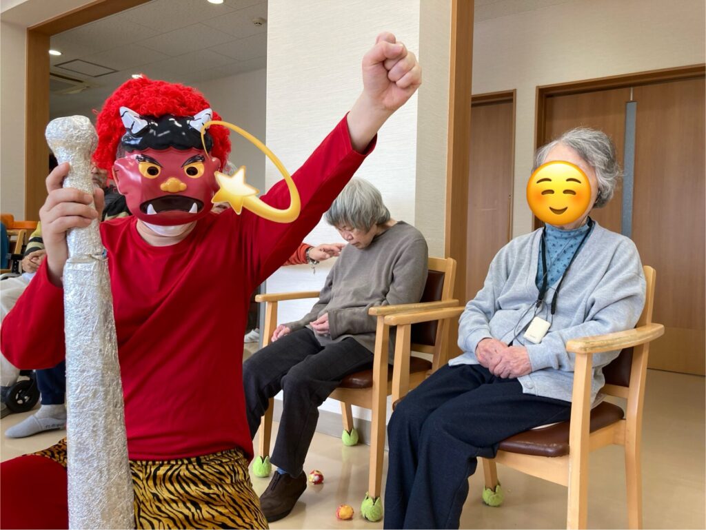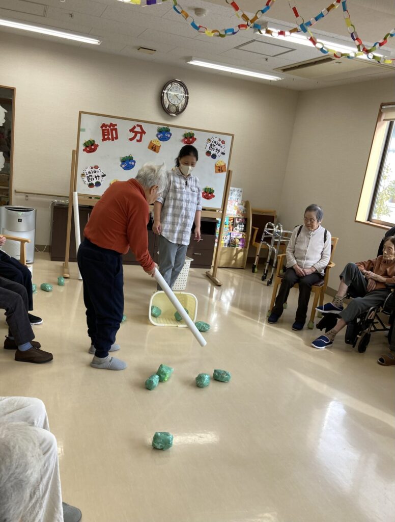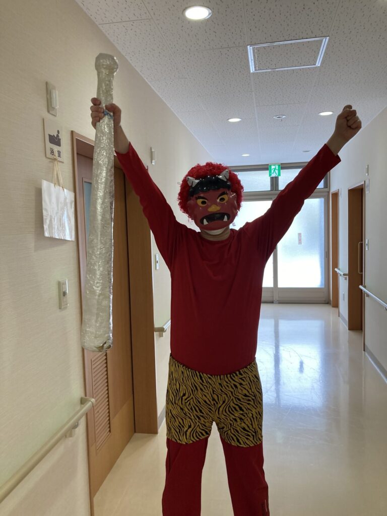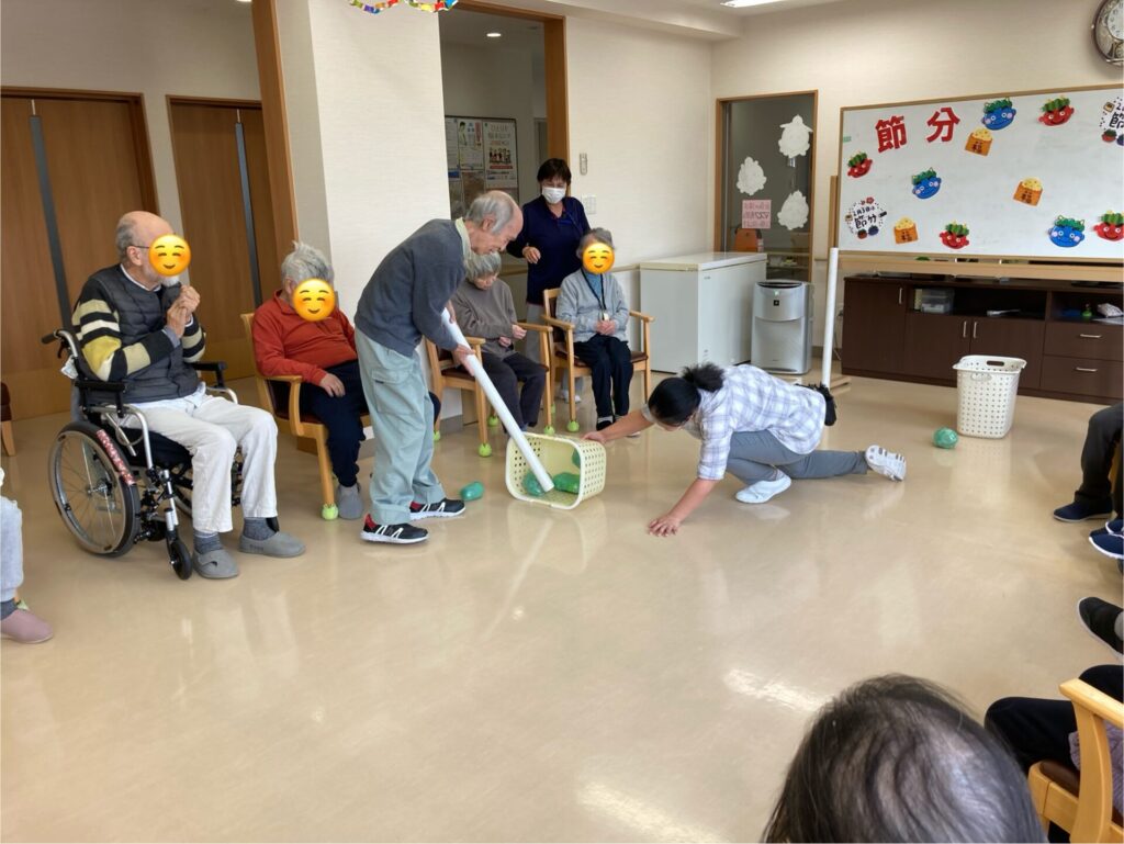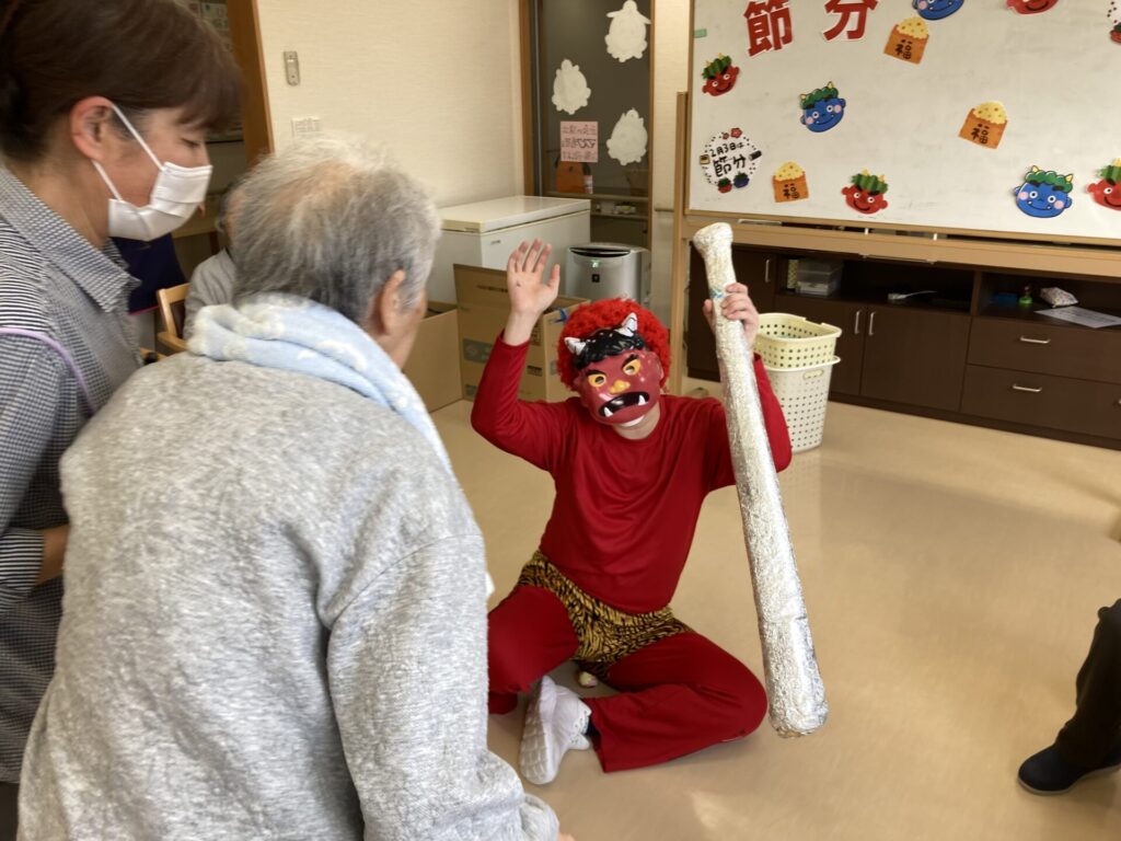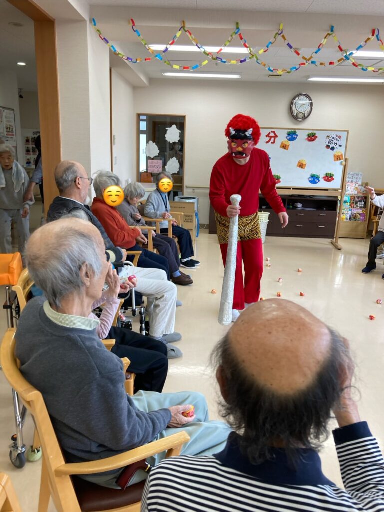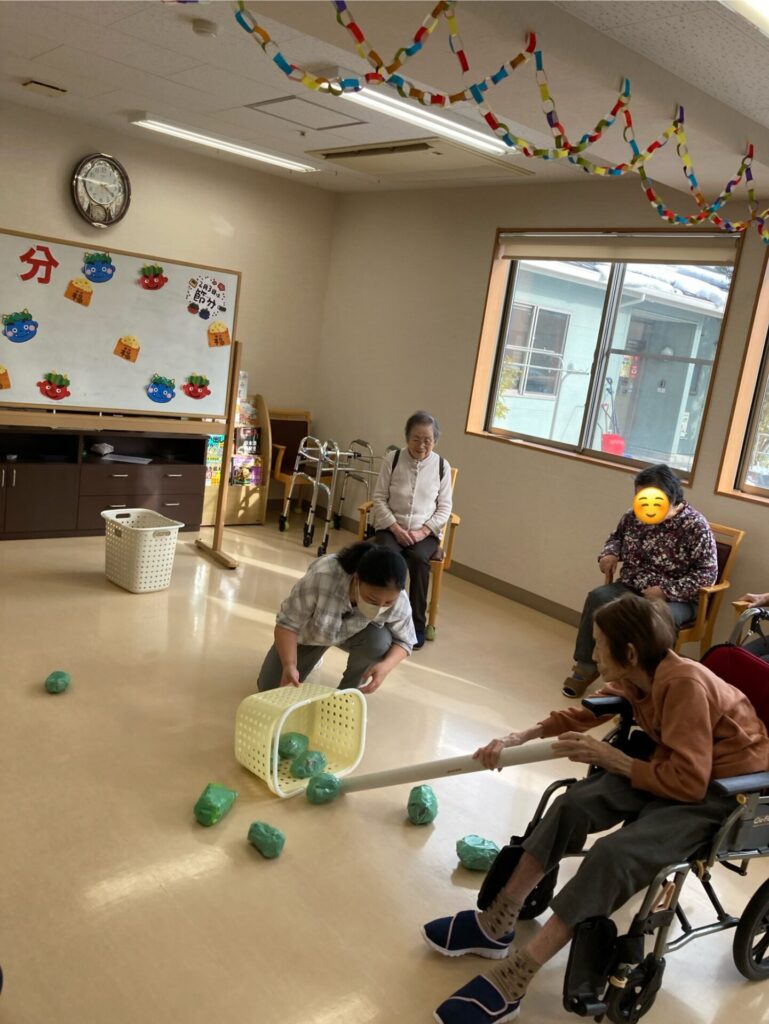 豆をカゴにシュートしたり、鬼が貼られたダンボールにめがけてお手玉を投げたり、最後は本物の鬼が登場💥