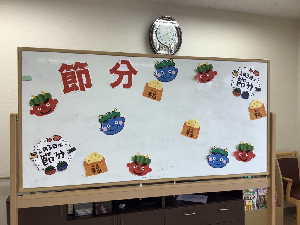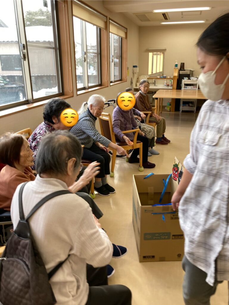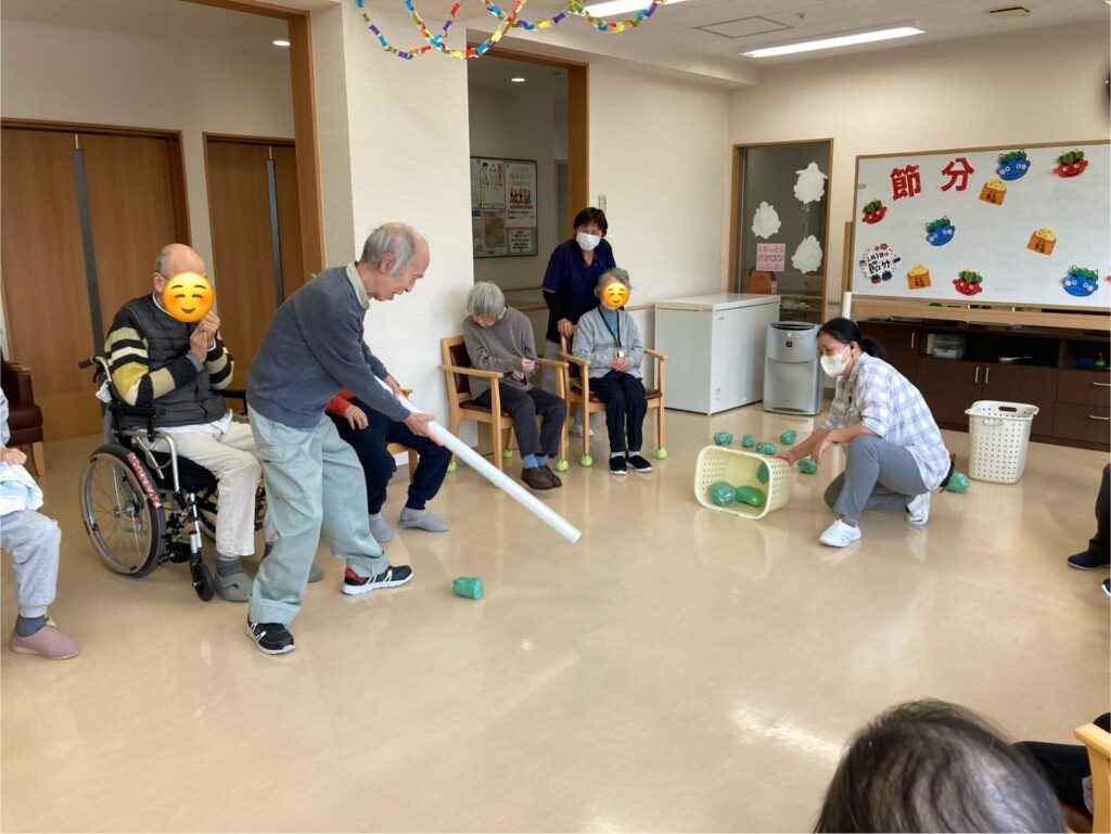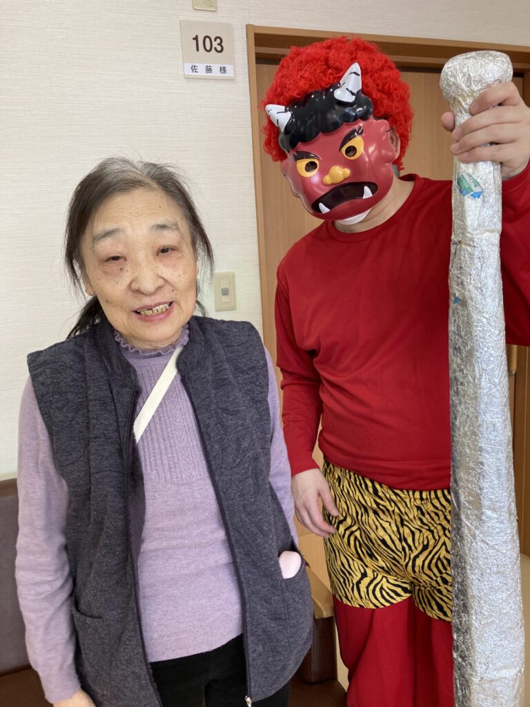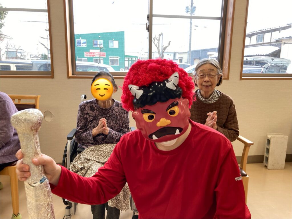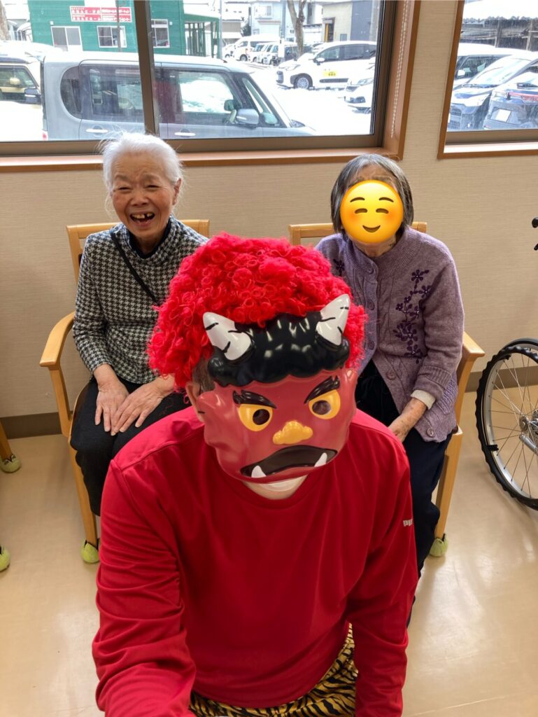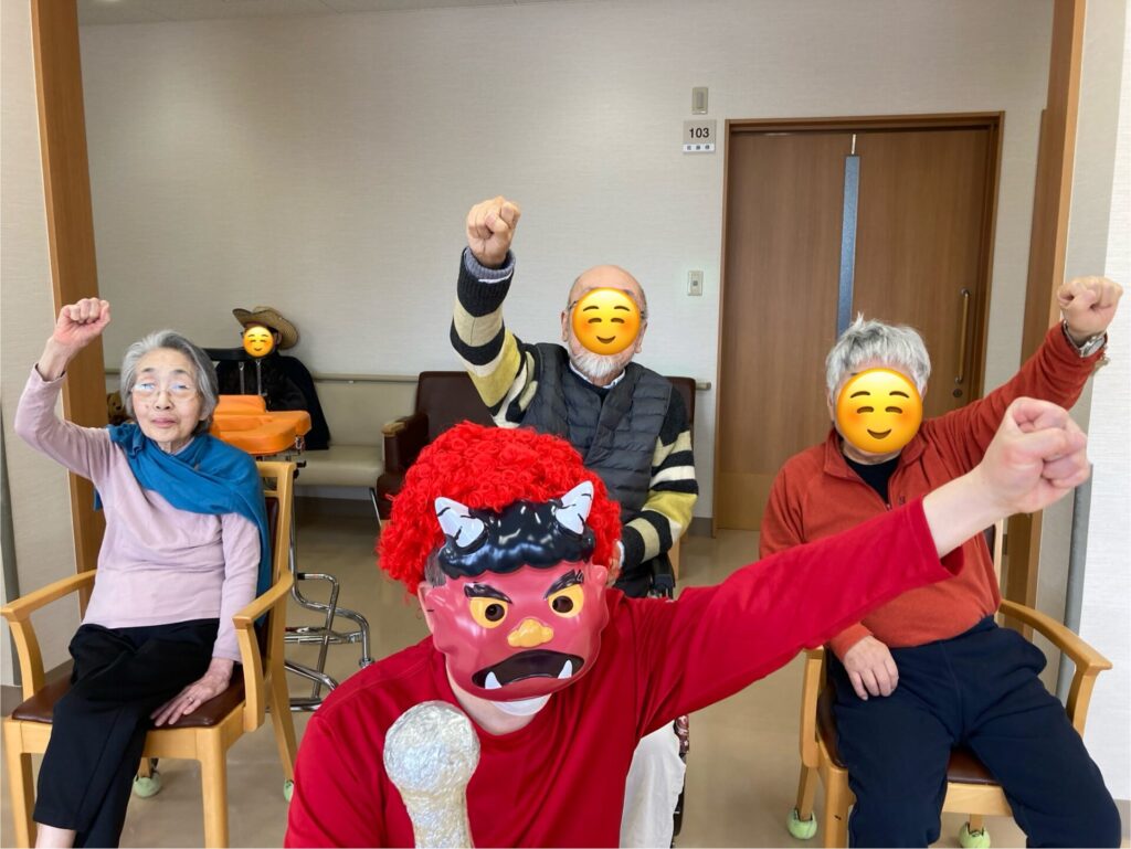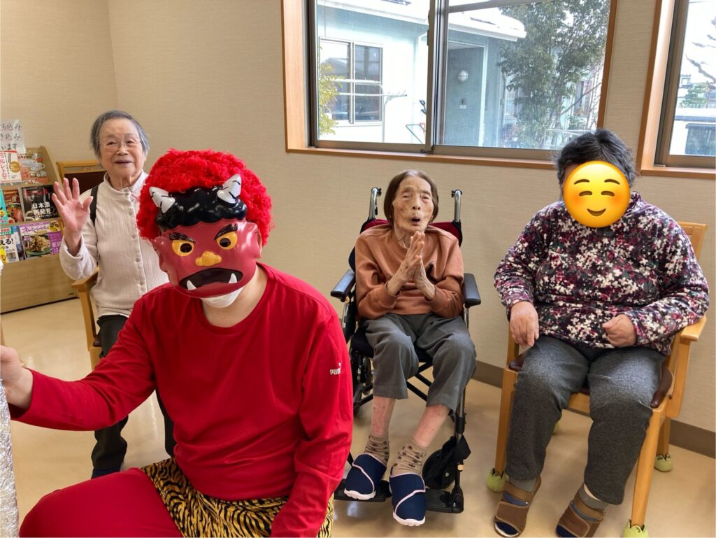 豆をカゴにシュートしたり、鬼が貼られたダンボールにめがけてお手玉を投げたり、最後は本物の鬼が登場💥