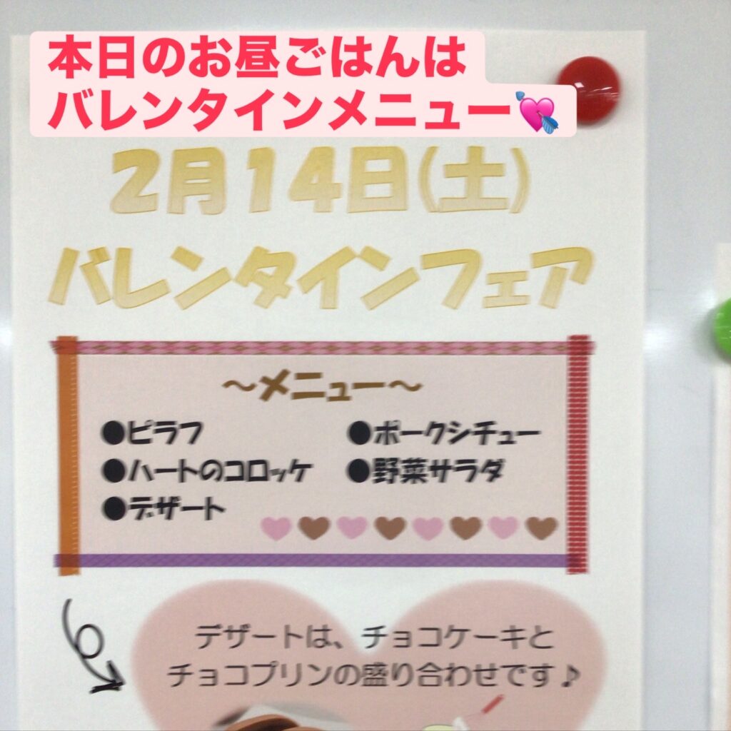 お知らせ 通所リハビリテーション 江風苑リハビリセンター100 バレンタインメニュー💘 2026年02月14日 本日のお昼ごはんは バレンタインメニューです♪ いいね (2) バレンタインデー💛 ハッピーバレンタイン💞