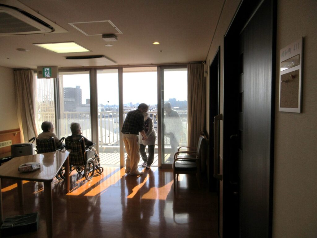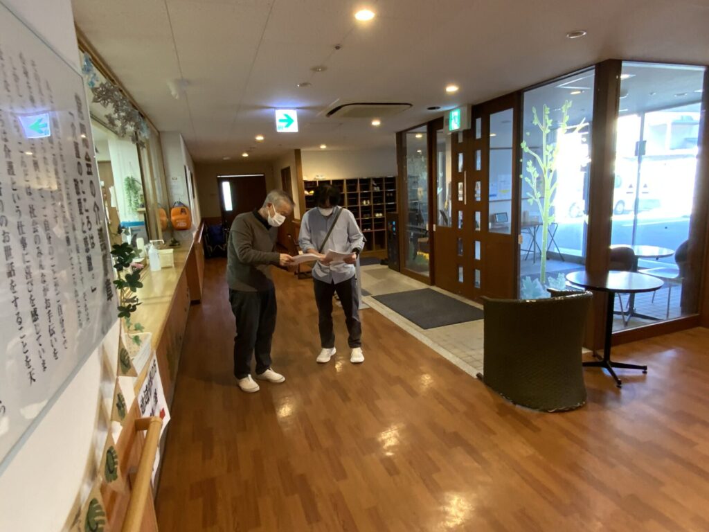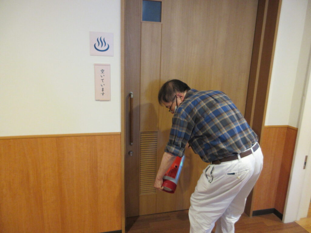 夜間の火災を想定、夜勤者役と守衛さんが参加し、ご利用者様にも協力していただきました。