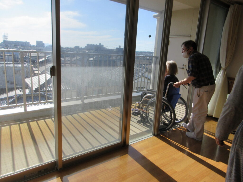 火元から離れるため、ベランダから反対側のユニットへ避難します。