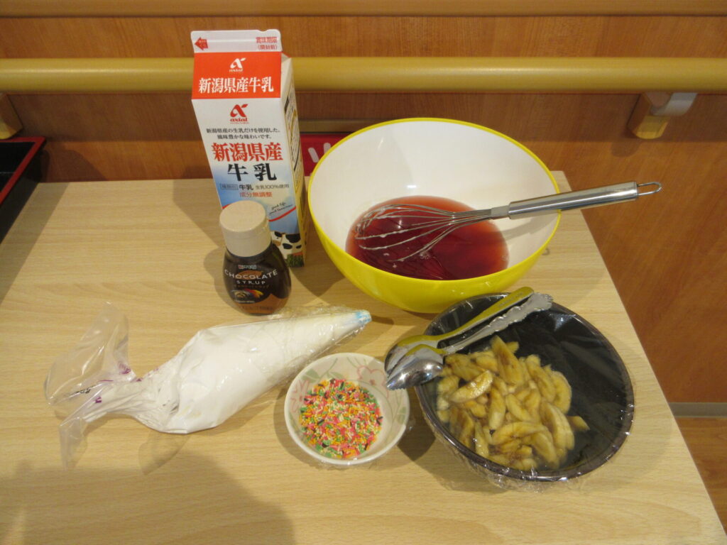いちごフルーチェと牛乳、トッピングのバナナ、ホイップクリーム、チョコスプレー、チョコソースを