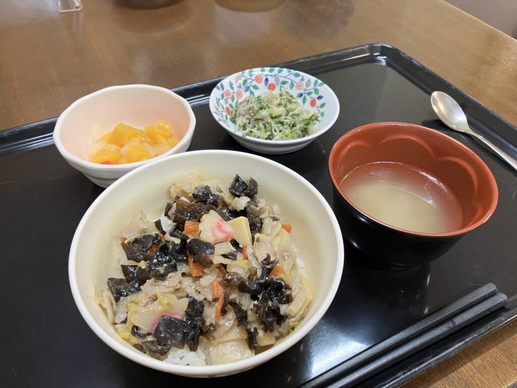 中華丼は、豚肉、エビ🦐、ナルト🍥、キクラゲ、筍、人参🥕、白菜と具沢山!!でボリュームがありました😊