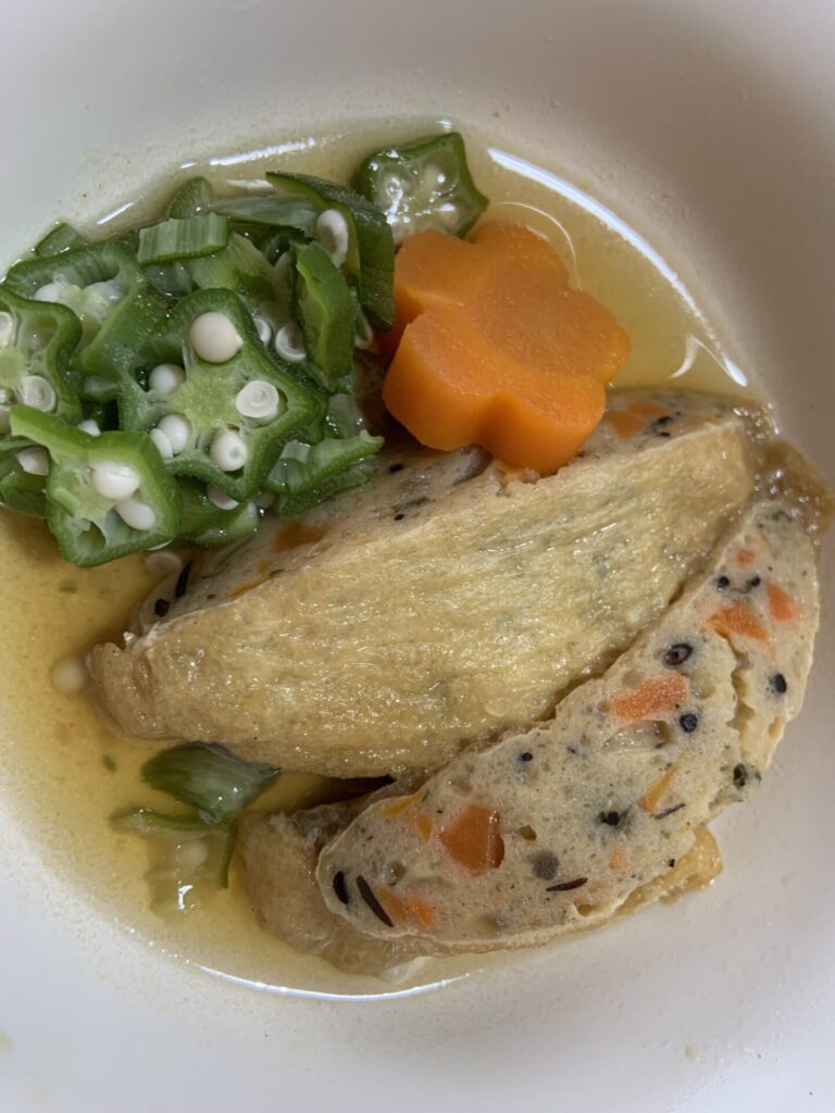 お揚げの中に具材の旨みをぎゅっと閉じ込めた、やさしい味わいの煮物です。