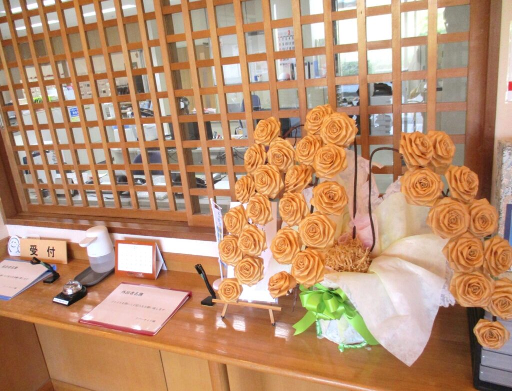 当施設の玄関には檜(ひのき)で作られたバラの飾りを置いています🌹🌹