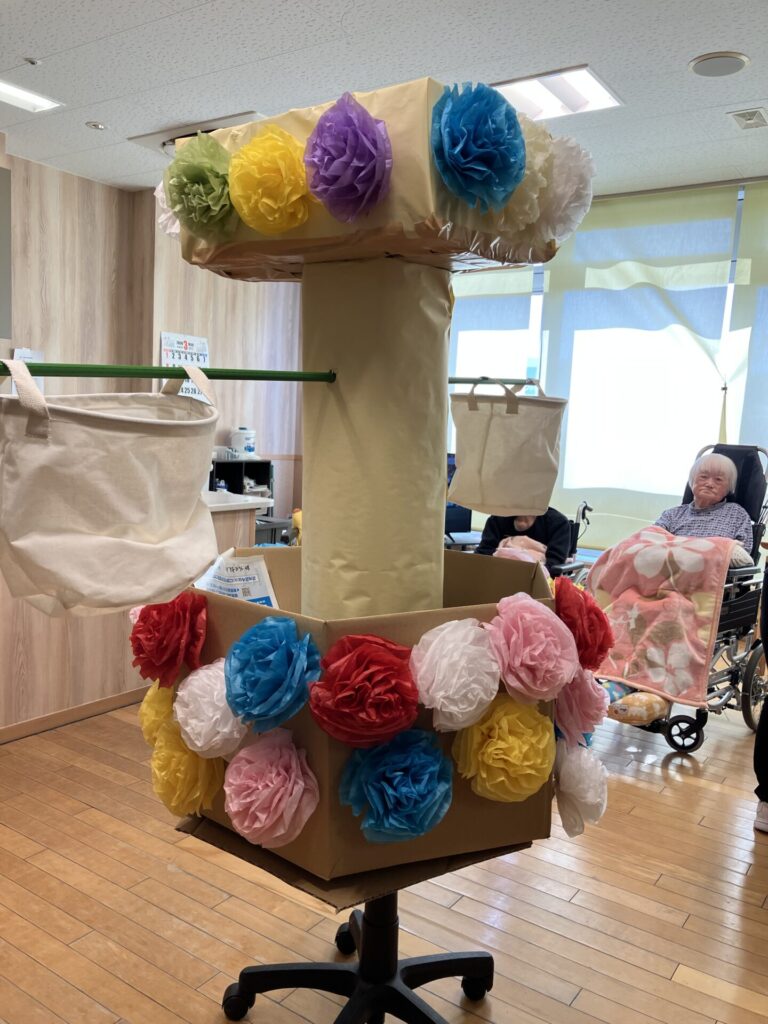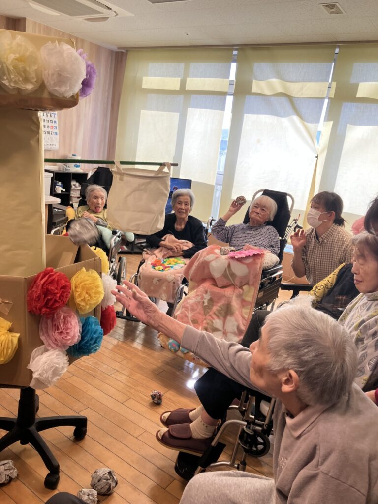 今日は職員手作りの玉入れセットで運動会をしました。