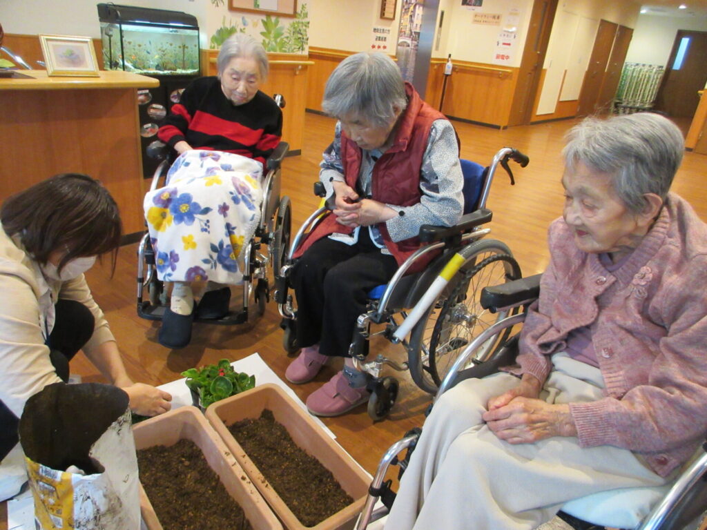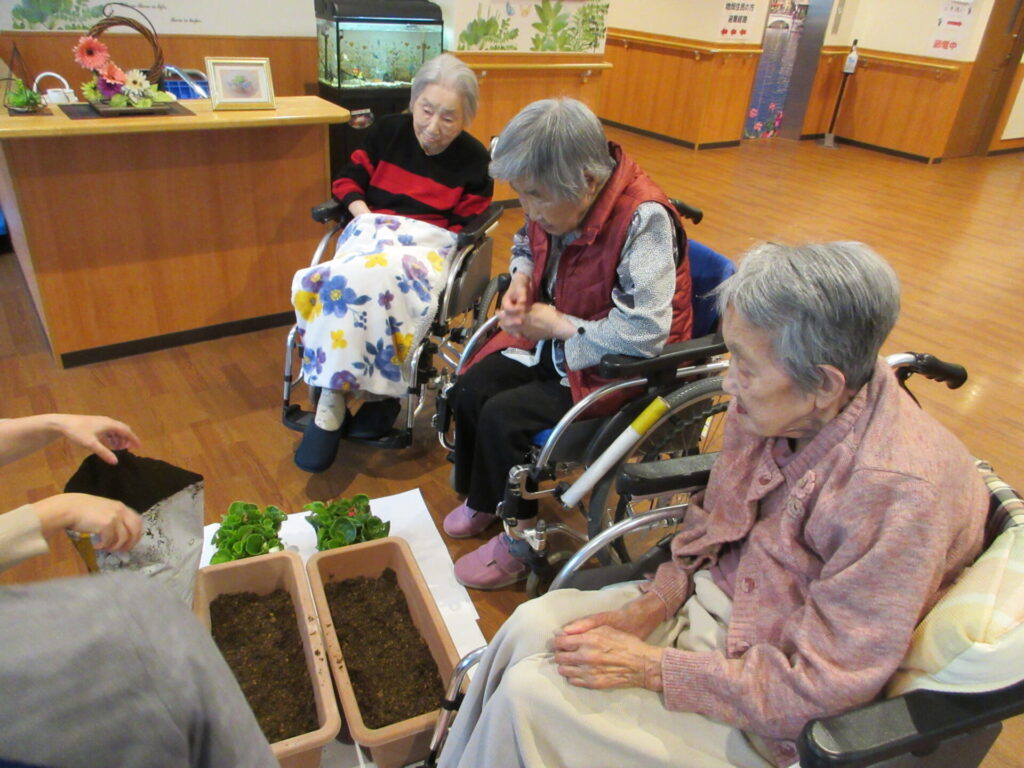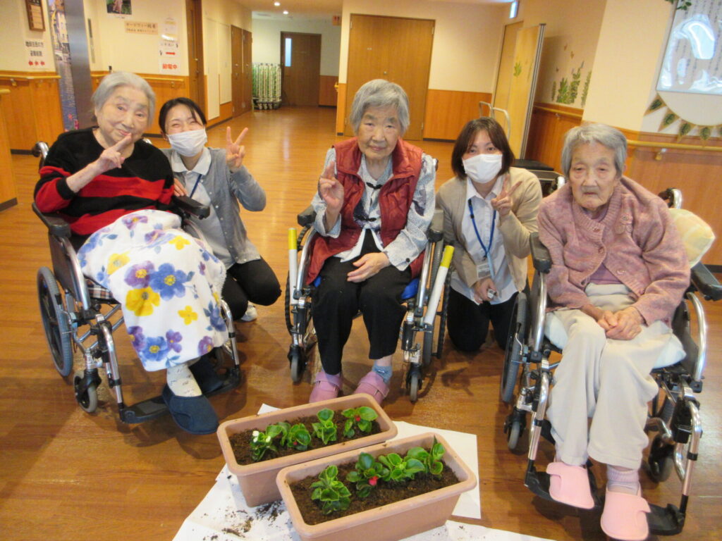 今日は、特養のご利用者様と一緒に玄関先に置くプランターにお花を植えました🌱