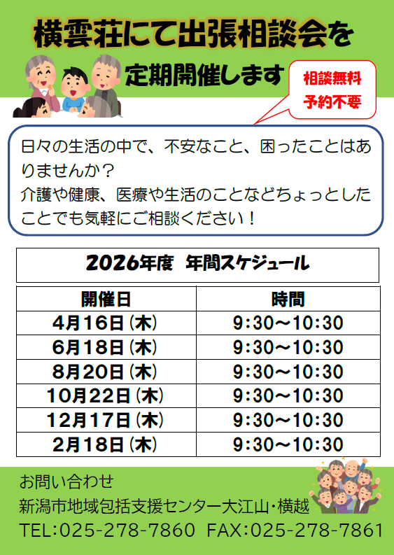 4月の回はすでに終了してしまいましたが、偶数月の第3木曜日に、横雲荘にて出張相談会を開催しています。